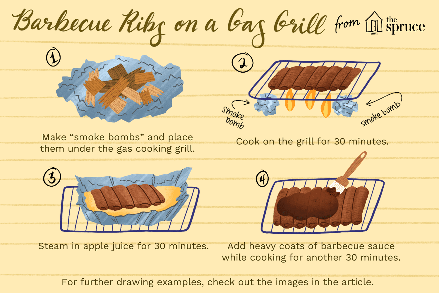 Cook ribs on a gas grill by using low indirect heat, light smoke, and slow, steady cooking.