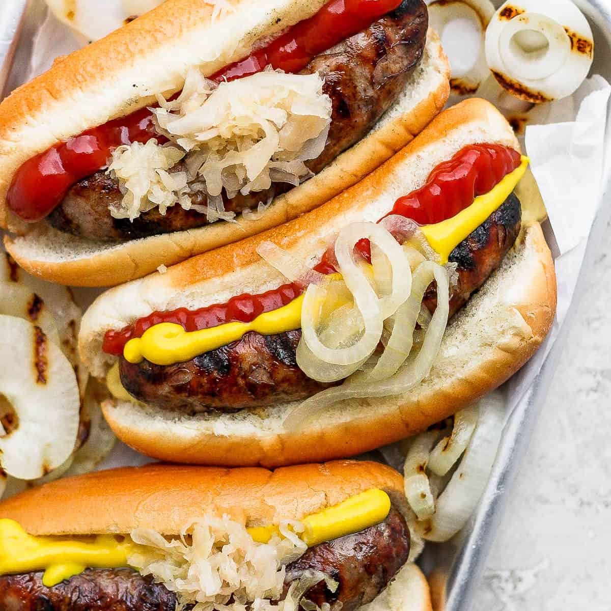 • Toasted buns, sauerkraut, yellow mustard, and grilled onions.